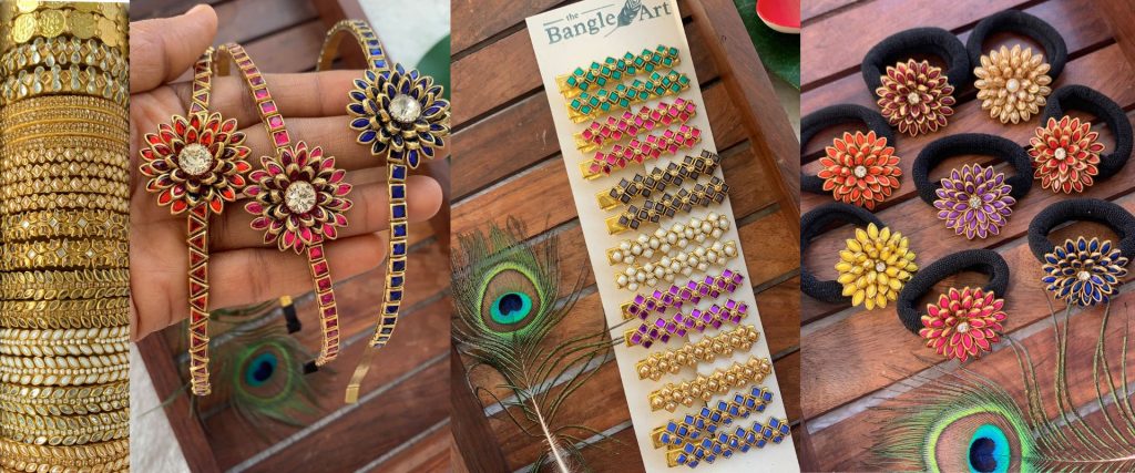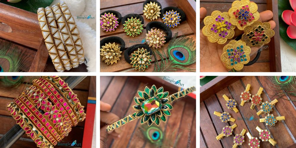 The Bangle Art was born from a love for handcrafted jewellery and timeless traditions. We create Handmade silk thread bangles, Kundan bangles, Bridal Bangle Collections, Headband for Kids, Hair Band, Alligator Hair Clips, Center Clips, Bridal Hair Accessories, Regular Office Wear Bangles, Outfit Matching Bangles, Silk Thread Earrings, Finger Rings, Flower Veni, Flower Clips, Banana Clips and Catch Clips that are made only after you place an order, allowing us to customise colours and designs to your preference. Every piece is carefully handcrafted with patience, precision, and passion. From festive wear to bridal collections, our jewellery is designed to complement your moments beautifully — one handcrafted bangle at a time