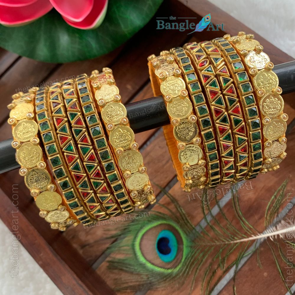 Elegant 6-bangle set per hand featuring 2 Lakshmi coin bangles paired with 4 mixed-color stone bangles. A beautiful blend of traditional auspicious motifs and vibrant stone detailing, perfect for bridal, temple, and festive wear. Color customization available as per preference.