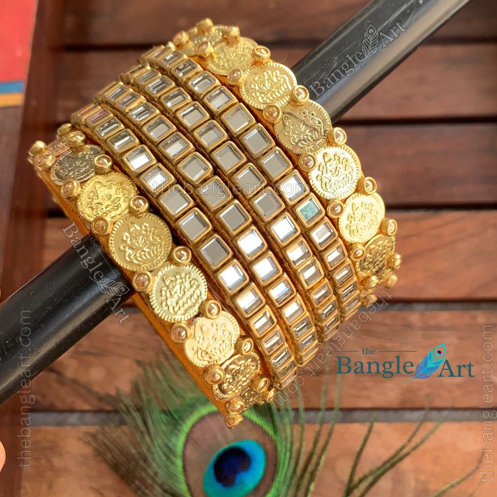 Elegant 6-bangle set featuring 2 Lakshmi coin bangles paired with 4 neatly finished stone bangles. A perfect combination of traditional charm and subtle sparkle, ideal for bridal, temple, and festive wear. Color customization available to match your outfit.